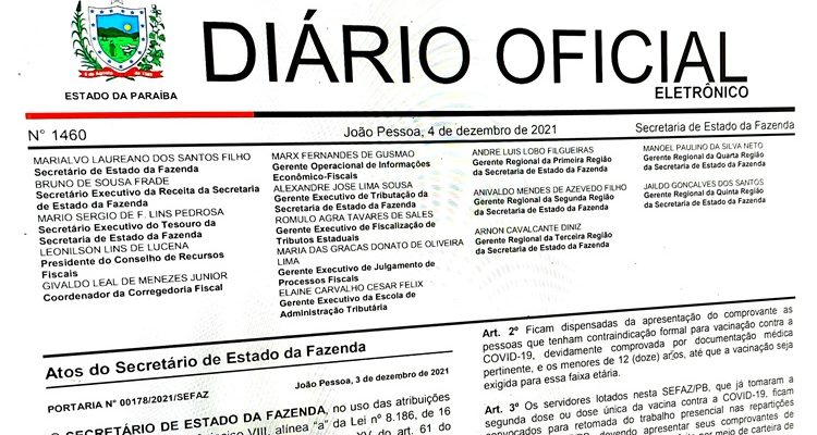 A Secretaria de Estado da Fazenda (SEFAZ-PB) publicou, neste sábado (4), no Diário Oficial Eletrônico da Sefaz (Doe-Sefaz-PB), a portaria […]
